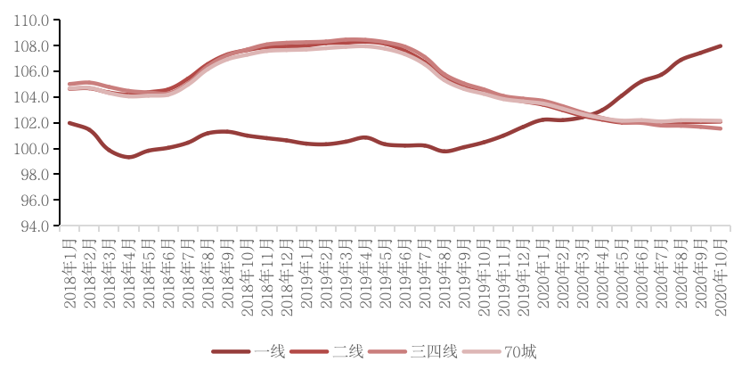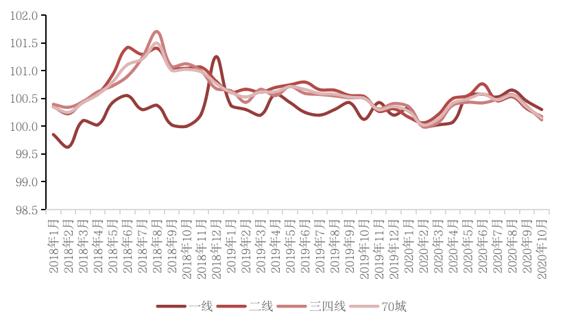 從全國70個大中城市商品住宅銷售價格來看,10月除一線城市同比漲幅繼續(xù)擴大外,其余二三線城市新房及二手房房價均同、環(huán)比漲幅收窄。具體來看,10月份,4個一線城市新建商品住宅銷售價格環(huán)比上漲0.3%,漲幅比上月回落0.1個百分點。其中,北京、上海、廣州和深圳分別上漲0.2%、0.3%、0.5%和0.2%。