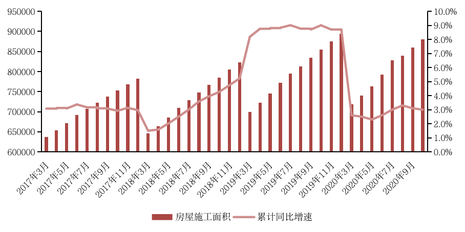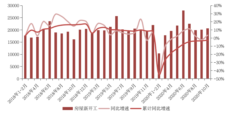 受中央融資“三條紅線”限制,房企迫切需要資金節(jié)流,但由于每年九、十兩月為傳統(tǒng)推盤旺季,再加上即將到來的年底銷售節(jié)點,項目新開工與加大建安投資也成為了各大房企的必然決策,因此10月房屋新開工面積同比單月由負轉(zhuǎn)正。