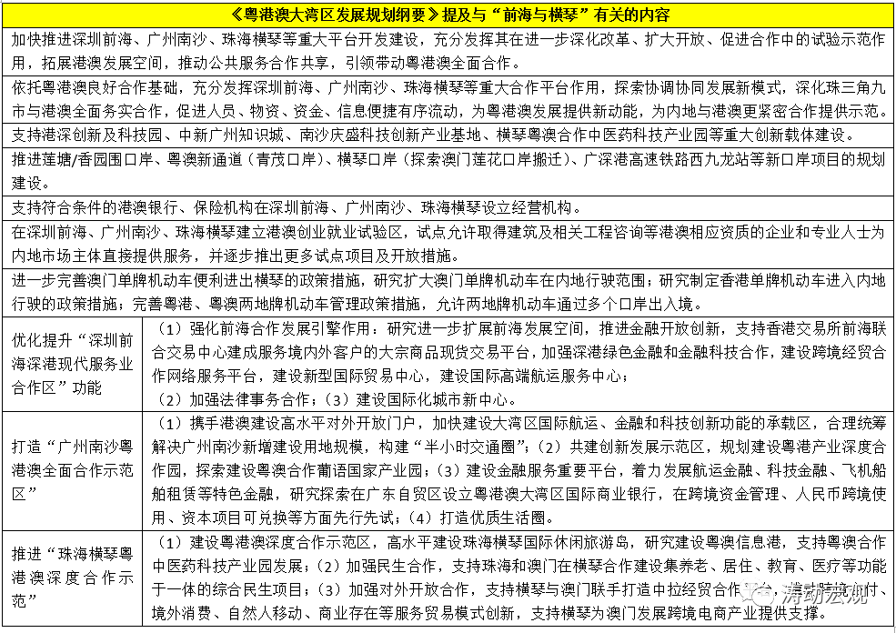(二)具體看,《粵港澳大灣區(qū)發(fā)展規(guī)劃綱要》專門在第十章“共建粵港澳合作發(fā)展平臺”中對三大合作區(qū)進行了討論,明確“加快推進深圳前海、廣州南沙、珠海橫琴等重大平臺開發(fā)建設(shè),充分發(fā)揮其在進一步深化改革、擴大開放、促進合作中的試驗示范作用,拓展港澳發(fā)展空間……引領(lǐng)帶動粵港澳全面合作”。