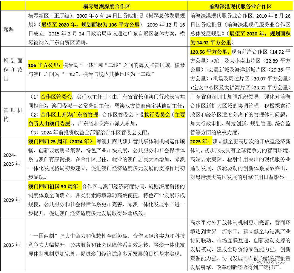 但有它們之間一些差異,主要體現(xiàn)在橫琴粵澳深度合作區(qū)的行政層級明顯提升(名義上升為廣東省管理、實際上澳門方面的權(quán)限更大),即橫澳合作區(qū)可以被看作是澳門島的擴容、實際上是以澳門為主在管理;深港合作區(qū)則是原前海合作區(qū)的擴容,主要為原前海合作區(qū)相關(guān)政策的平移、仍延續(xù)現(xiàn)行管理模式。