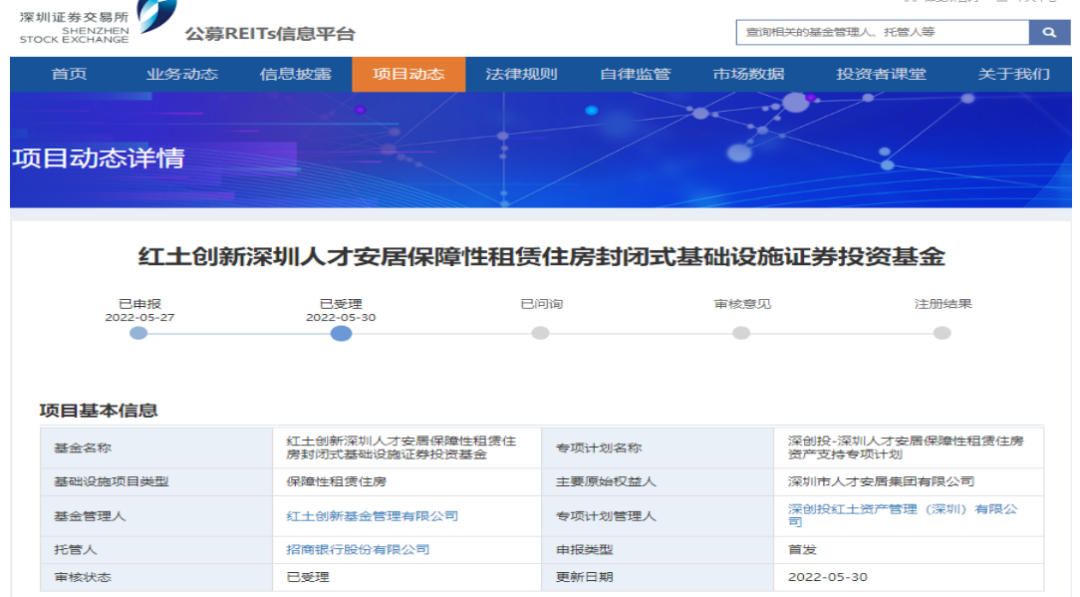 5月27日,中金廈門安居保障性租賃住房、紅土創(chuàng)新深圳人才安居保障性租賃住房?jī)芍EITs分別向上交所、深交所和證監(jiān)會(huì)報(bào)送申請(qǐng)材料,成為首批上報(bào)的兩單保障性租賃住房REITs。