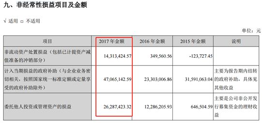 財(cái)報(bào)顯示:公司利潤(rùn)大幅飆升主要因政府補(bǔ)助、處置資產(chǎn)及理財(cái)收益等非經(jīng)常性損益大幅增加。2017年,公司政府補(bǔ)助、處置資產(chǎn)及理財(cái)收益合計(jì)金額約8766.6萬(wàn)元,占到當(dāng)期歸母凈利潤(rùn)的83%。以下為年報(bào)披露數(shù)據(jù):