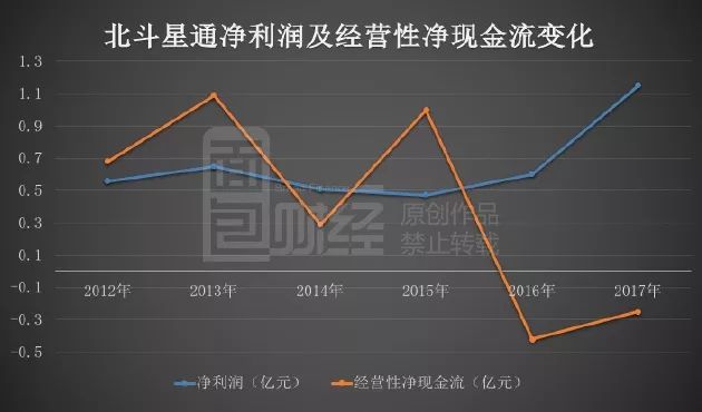 盡管,北斗星通凈利潤(rùn)大幅飆升,但公司的經(jīng)營(yíng)性凈現(xiàn)金流卻已經(jīng)持續(xù)兩年為負(fù):2016年及2017年,公司經(jīng)營(yíng)性凈現(xiàn)金流分別為負(fù)的約0.42億及約0.25億。