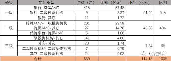 根據(jù)行業(yè)慣例把銀行(信托)出包定為一級(jí)市場,AMC收包、出包,代持平臺(tái)出包定為二級(jí)市場,其它民營投資機(jī)構(gòu)為三級(jí)市場,并且把3戶以上的受讓、出讓方定為二級(jí)投資機(jī)構(gòu)。
