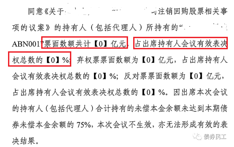 當(dāng)然,這并不是第一個(gè)債券持有人零參與的持有人會(huì)議。之前披露的公告中,某個(gè)ABN參會(huì)債券持有人持有債券金額占存續(xù)債券總額的0%,也是持有人另參與。