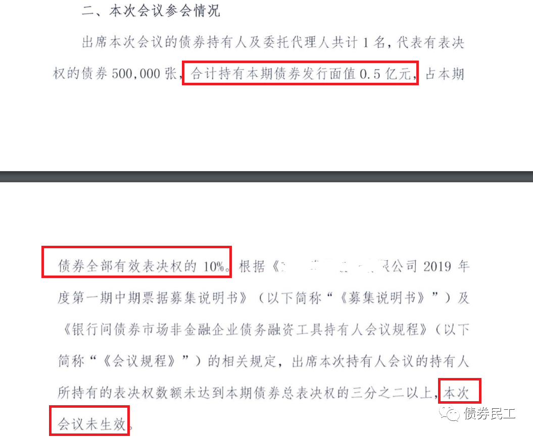 持有人會(huì)議未生效的主要原因是參會(huì)的持有人數(shù)不夠,注意是參會(huì)人數(shù)未達(dá)到約定的標(biāo)準(zhǔn),不是投反對(duì)票的人數(shù)。但是也真沒想到,部分債券持有人會(huì)議的參會(huì)比例會(huì)是如此之低。讓我們一起來看幾個(gè)近期未生效的債券持有人會(huì)議案例:
