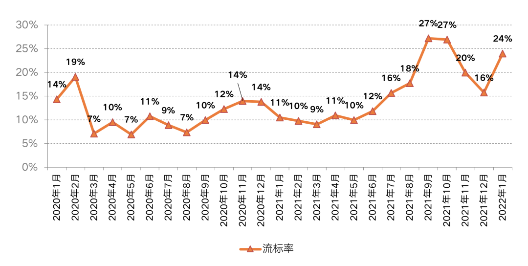 資金流仍面臨較大壓力的房企拿地意愿不強,開年首月流拍現(xiàn)象較去年年末有所加重,流拍率升至24%。
