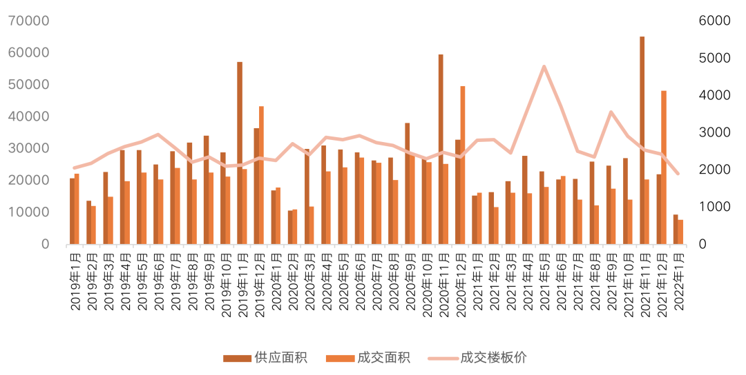 2022年1月全國土地市場供應建面周期性回落,CRIC統(tǒng)計數(shù)據(jù)顯示,當月全國經(jīng)營性土地供應總建筑面積僅為9485萬平方米,環(huán)比下降39%。土地供應量是2019年以來最低的一個月。