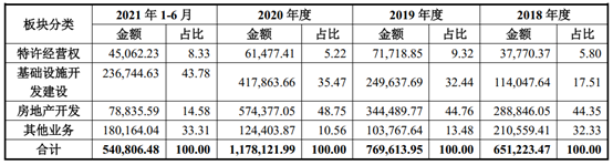 近三年特許經(jīng)營權(quán)業(yè)務(wù)收入分別為37,770.37萬元、71,718.85萬元和61,477.41萬元,占營業(yè)收入的比例分別為5.80%、9.32%和5.22%;近三年基礎(chǔ)設(shè)施開發(fā)建設(shè)業(yè)務(wù)收入分別為114,047.64萬元、249,637.69萬元和417,863.66萬元,占營業(yè)收入的比例分別為17.51%、32.44%和35.47%。