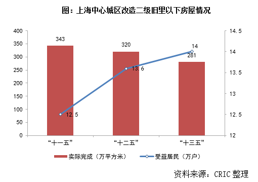 從“十一五”至“十三五”期間,中心城區二級舊里以下房屋改造總受益居民超40萬戶,其中“十一五”期間中心城區實際完成343萬平方米;“十二五”期間完成320萬平方米;“十三五”期間完成281萬平方米。