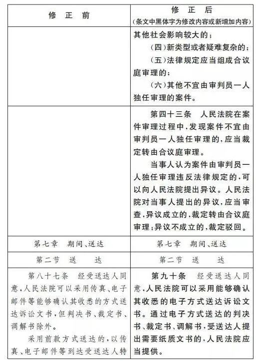 三、《草案》第九十條將電子送達途徑由“傳真、電子郵件等”改為“電子方式”,同時將現(xiàn)行的“但判決書、裁定書、調(diào)解書除外”改為“通過電子方式送達的判決書、裁定書、調(diào)解書,受送達人提出需要紙質(zhì)文書的,人民法院應(yīng)當提供”。