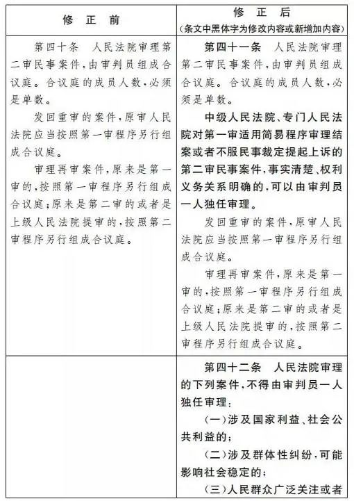 七、另外新增了獨任審判員制度可適用一審普通程序和二審程序的規(guī)定,同時將獨任審判員的適用條件以消極條件的方式列出。