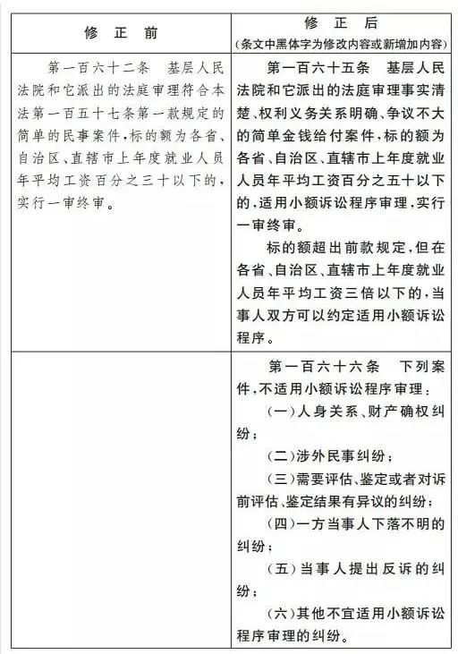 五、小額訴訟程序適用標的額從原來的“各省、自治區(qū)、直轄市上年度就業(yè)人員年平均工資百分之三十以下”提升到“百分之五十以下”,新增當事人合意選擇適用模式。