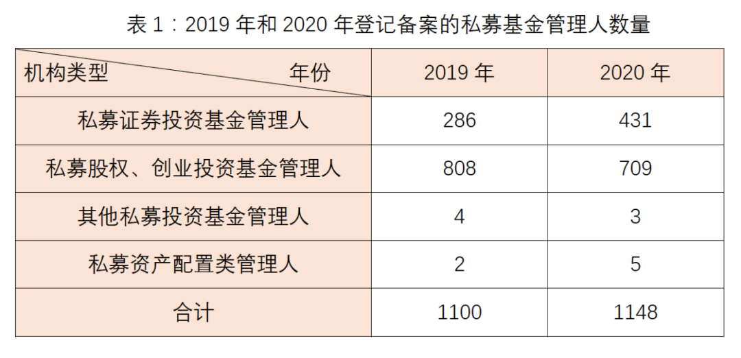 2. 2020年1月至2020年12月登記備案的私募基金管理人的分類情況如下表:
