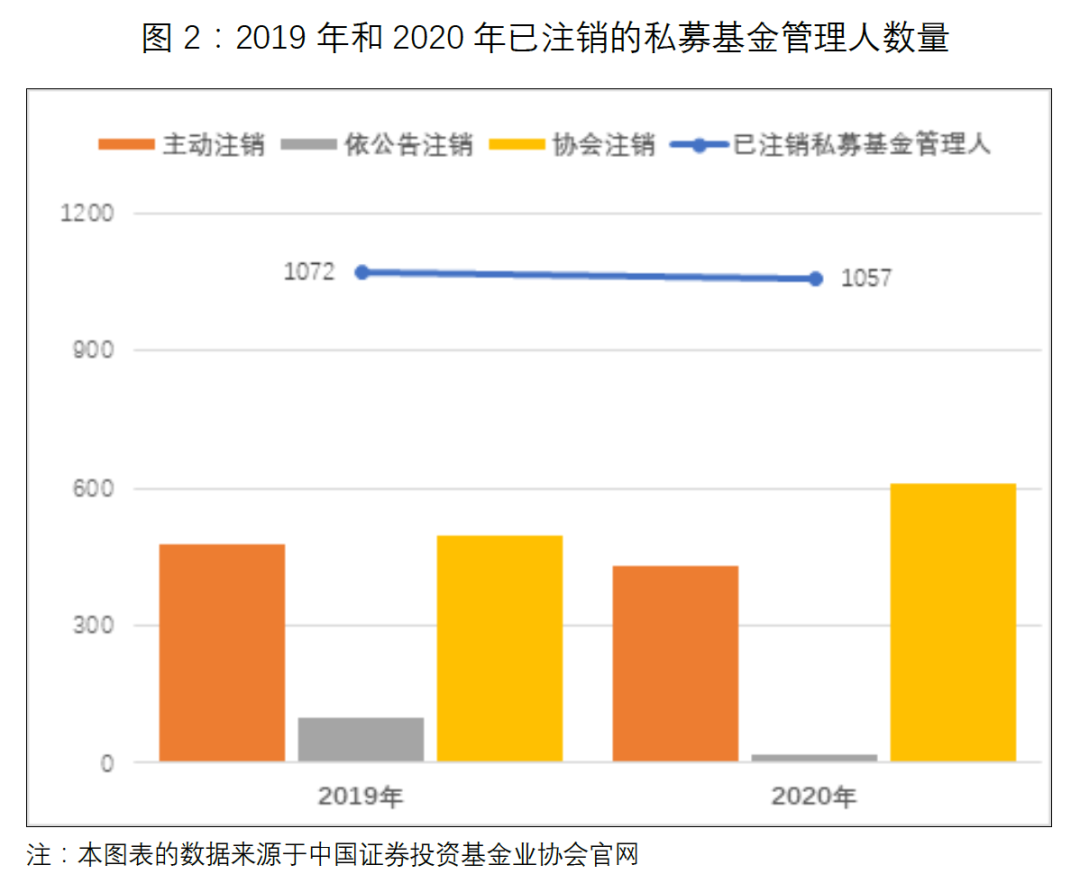 2019年已注銷私募基金管理人共1072家,其中主動注銷的私募基金管理人479家,依公告注銷的私募基金管理人97家,協(xié)會注銷的私募基金管理人496家。2020年已注銷私募基金管理人共1057家,其中主動注銷的私募基金管理人431家,依公告注銷的私募基金管理人18家,協(xié)會注銷的私募基金管理人608家。