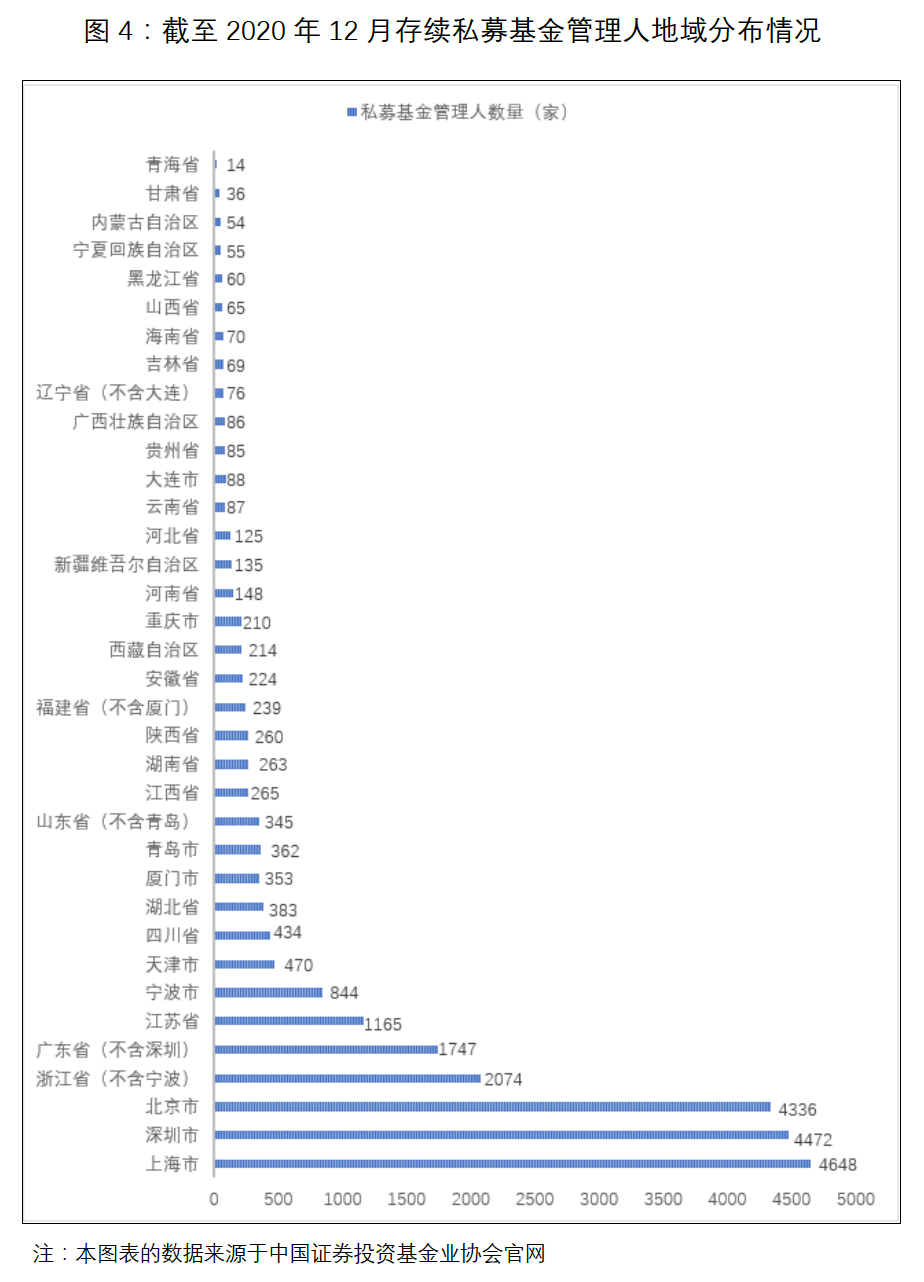 截至2020年12月,在中基協(xié)登記備案的私募基金管理人共24561家,其中大部分分布在北上廣深等經濟發(fā)達城市,上海市共存續(xù)4648家私募基金管理人,居于首位;深圳市次之,共存續(xù)4472家私募基金管理人,遠超廣東省其他城市;北京市居第三位,共存續(xù)4336家私募基金管理人。