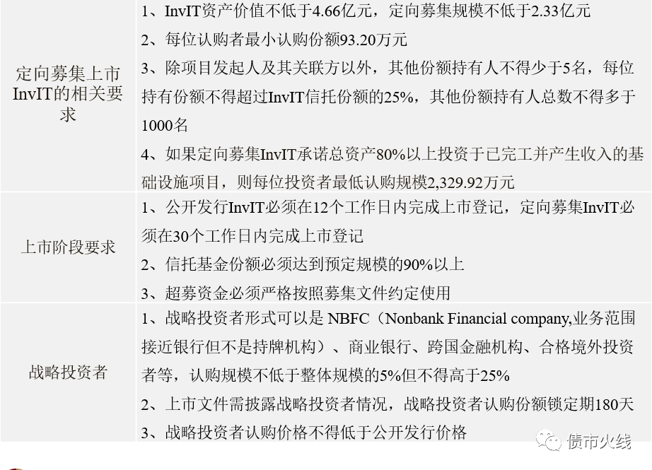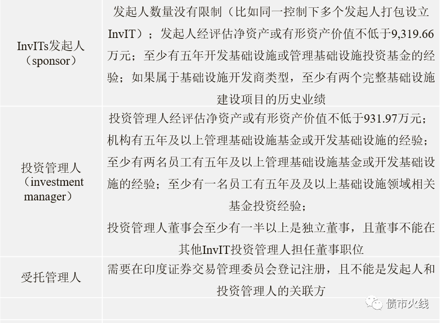印度證券交易管理委員會(SEBI)于2007年發(fā)布REITs監(jiān)管文件草案,通過與政府部門、地產(chǎn)開發(fā)商和投資者的合作磋商并借鑒國外成熟市場的經(jīng)驗(yàn),最終在2014年頒布了目前施行的REITs監(jiān)管文件,2019年4月India’s maiden REITs的上市讓印度REITs最終破繭而出。在REITs監(jiān)管文件和產(chǎn)品上市的同時,印度的invITs也是在同步發(fā)展,目前已有“Indian Grid Trust”和“IRB INvIT Fund”兩只產(chǎn)品在NSX上市。其實(shí)印度REITs和invITs載體均為信托,在產(chǎn)品結(jié)構(gòu)和監(jiān)管條款上有許多相似之處,以下就是對印度invITs的監(jiān)管規(guī)則進(jìn)行簡要的概述: