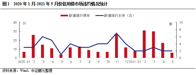 信用風險事件回顧:2021年5月份發生信用風險事件9次,涉及7家發行人。其中,首次違約的主體有2家。具體看,首次違約債券特征:5月首次違約債券6只,涉及5家發行人。從違約類型看,本月新增違約債券均為實質性違約。從違約事件看,均為本金利息項違約。從債券類型看,公司債4只,私募債1只,中期票據1只。從企業性質看,2家新增違約主體均為民營企業。從上市情況看,本月新增違約主體均為非上市公司。從處置方式看,“16晟晏債”與持有人達成展期兌付協議,其他債券均未公布兌付方案。