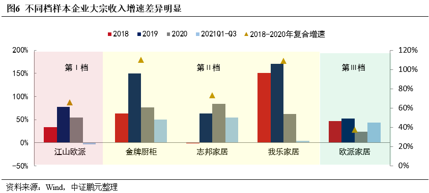 本次房企風險事件主要通過大宗業務影響定制家居企業,本報告選取10家上市定制家居企業作為樣本(見附錄一),并根據2021年上半年大宗業務收入占比將樣本企業分為3檔,以觀察其過往財務表現。其中大宗業務收入占比在40%以上為第I檔(江山歐派、皮阿諾);占比在20%-40%為第II檔(金牌廚柜、頂固集創、好萊客、志邦家居、我樂家居);占比在20%以下為第III檔(歐派家居、索菲亞、尚品宅配)。