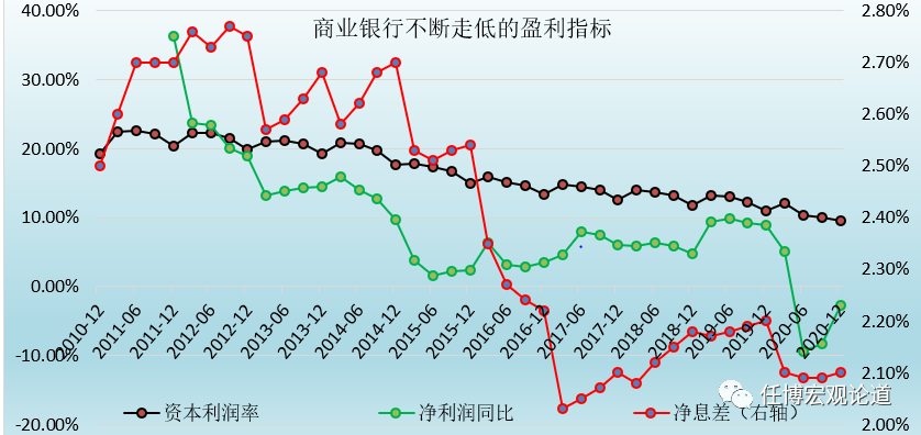 2、同樣是2010年以來,商業(yè)銀行的資本利潤率亦由最初的20%以上大幅下滑至目前的10%左右,十年時間里下降約10個百分點。