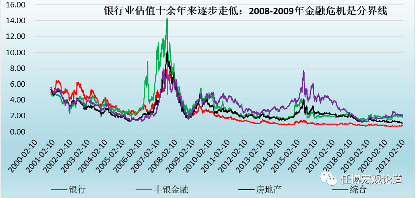 截至2021年2月10日,A股上市銀行、非銀金融、房地產業(yè)的市凈率分別為0.80、1.81和1.07,均略低于2.06的平均水平,上市銀行的估值水平基本處于絕對低位。但如果將2000年以來的數(shù)據(jù)拿過來進行對比會發(fā)現(xiàn)以下幾個特征:
