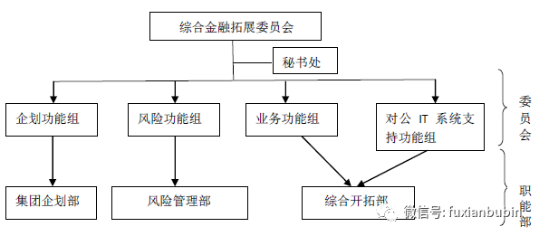 綜合金融拓展委員會是綜合金融推進的最高決策機構,僅存在于集團層面,并不是常設機構,作為最上層的組織建構,均是由各子公司主要負責人組成,對內負責統籌集團化運作發展目標的制定,督促各子公司業務的落實;對外負責與監管機構的溝通交流,團金會設執行官作為最高領導,通常由旗下最重要的金融機構負責人擔任,設有秘書處負責日常工作的開展。綜合金融拓展委員會主要負責宏觀業務導向和發展目標設定,具體工作職責包括擬定并實施集團綜合金融開拓戰略,制定綜合開拓相關流程和政策,制定、推動并追蹤評估綜合金融開拓計劃預算,溝通協調解決子公司間沖突、平衡渠道利益,統籌綜合金融開拓產品與整合后援支持體系,協調跨系列大項目并追蹤其落地執行情況等六個方面。在具體工作機制上,綜合金融拓展委員會基本上會按月或按季召開會議,負責跟蹤年初設定目標的落地執行情況,并根據需要適當調整經營目標。
