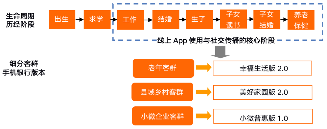 多種界面的手機(jī)銀行,也是圍繞人生必經(jīng)的發(fā)展階段而展開設(shè)計(jì)。從出生、求學(xué)、工作到養(yǎng)老保健等環(huán)節(jié),零售用戶與智能設(shè)備之間的智能連接關(guān)系日漸緊密。從手機(jī)銀行的使用客群年齡來(lái)看,主要是工作后的用戶群體為主。同時(shí),針對(duì)不同身份特征的人群,手機(jī)銀行也細(xì)分為多個(gè)版本。工商銀行7.0版本手機(jī)銀行,分為三個(gè)細(xì)分人群專屬界面,即針對(duì)老年客群的幸福生活版2.0、針對(duì)縣域農(nóng)村人群的美好家園版2.0、針對(duì)小微企業(yè)主的小微普惠版1.0,前兩個(gè)界面是對(duì)此前發(fā)布版本的進(jìn)一步優(yōu)化。