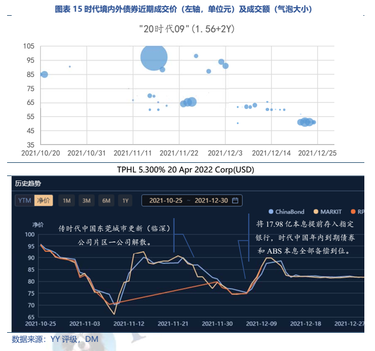 時代中國12月7日對年內所有到期債券及ABS備償完畢,美元債價格對此產生積極反應,但隨后境內外債券又出現下跌,市場猜測為公募機構換倉??紤]到公司舊改業務涉及較多表外融資,透明度較低,不排除存在非公開的非標融資輿情的可能。