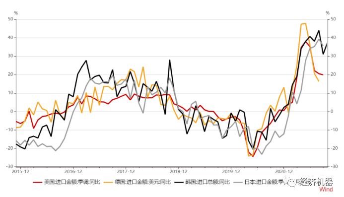 2)各國進口需求依舊旺盛。歐美各國進口增速近期出現一定的回落,但仍維持在20%左右。亞洲各國的出口表現的相對強勢,仍維持在30%以上的增速。特別是韓國,進出口保持強勢(圖4)。韓國有國際貿易晴雨表的地位,其貿易進出口持續強勢,顯示各國需求中短期內將保持在一個較強勁的狀態。