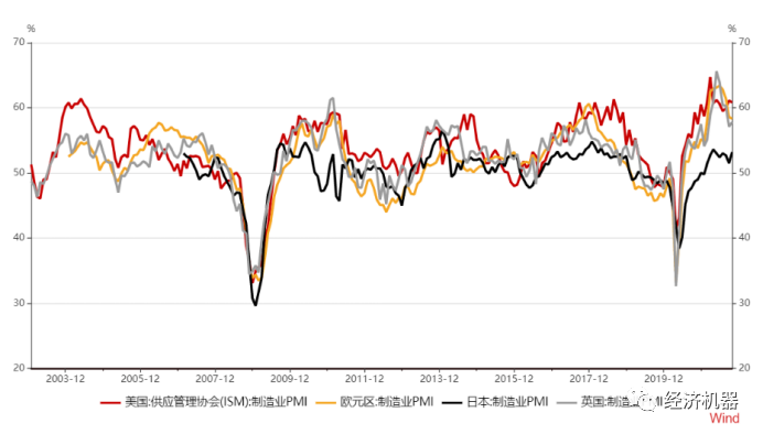 1)主要發達國家PMI處于高位。美國ISM PMI仍處在60以上的極高景氣狀態,歐元區PMI連續4個月高點回落,但仍有58.3。整體來看,主要發達經濟體仍處于較高景氣階段(圖4)。