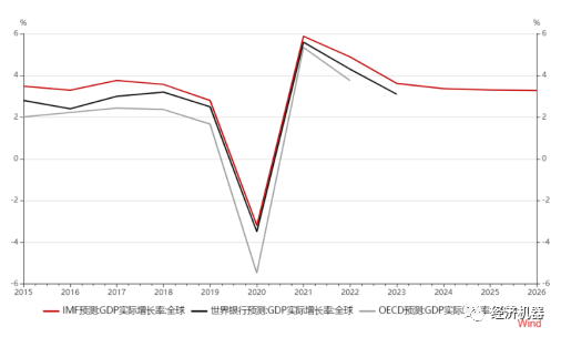 3)未來一兩年內,海外經濟增速趨于回歸疫情前平均水平。主要機構預測全球GDP增速將于2021年達到高點后逐步回落,2023年左右恢復至疫情前3.5左右的平均增速,不會出現急劇的放緩(圖5)。