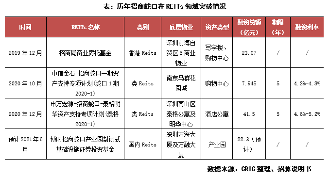 2019年12月,招商蛇口發(fā)起招商局商業(yè)房托基金(REITs)于港交所掛牌,基金投資組合包括旗下深圳前海自貿(mào)區(qū)的5個(gè)商業(yè)物業(yè),資產(chǎn)估值65.17億元。2020年底,招商蛇口還成功發(fā)行了“申萬(wàn)宏源-招商蛇口-泰格明華資產(chǎn)支持專項(xiàng)計(jì)劃”,為招商蛇口首單酒店公寓類REITs產(chǎn)品。