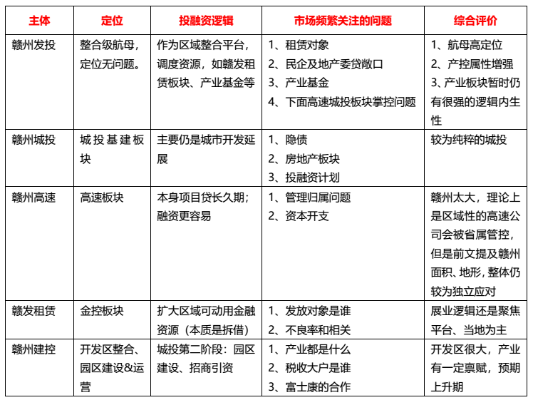 這些問題短期很難立即得到一致的答案,但正所謂有分歧才有博弈,才有價格。市場主流機構對贛州的投資也基本在幾大市級平臺,整體如下: