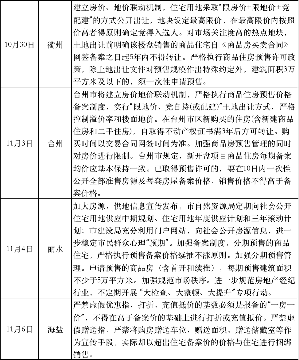 “十四五”規(guī)劃建議發(fā)布的同一天,浙江臺(tái)州升級(jí)了樓市調(diào)控,規(guī)定在臺(tái)州市區(qū)新購(gòu)買(mǎi)的住房(含新建商品住房和二手住房),自取得不動(dòng)產(chǎn)權(quán)證書(shū)滿(mǎn)3年后方可轉(zhuǎn)讓。麗水緊跟其后明確“四個(gè)加強(qiáng)”調(diào)控措施。