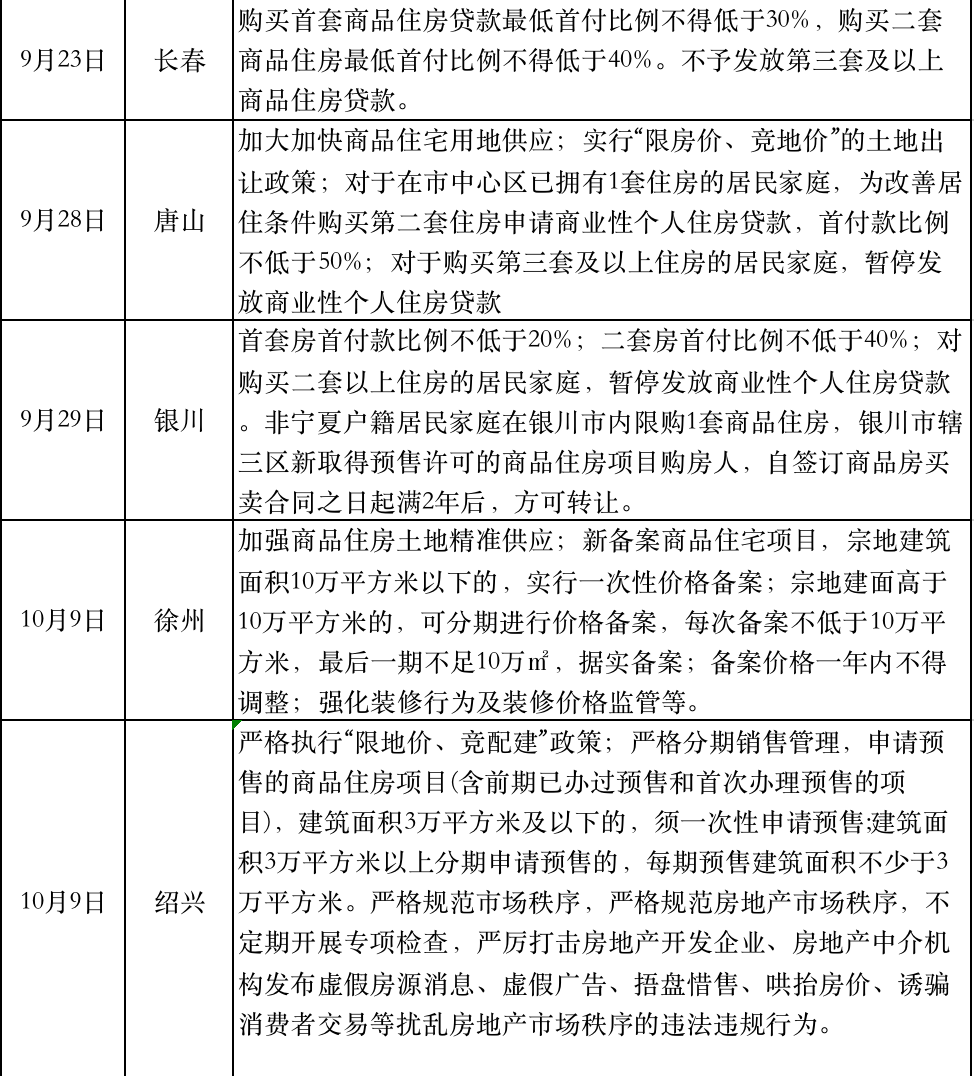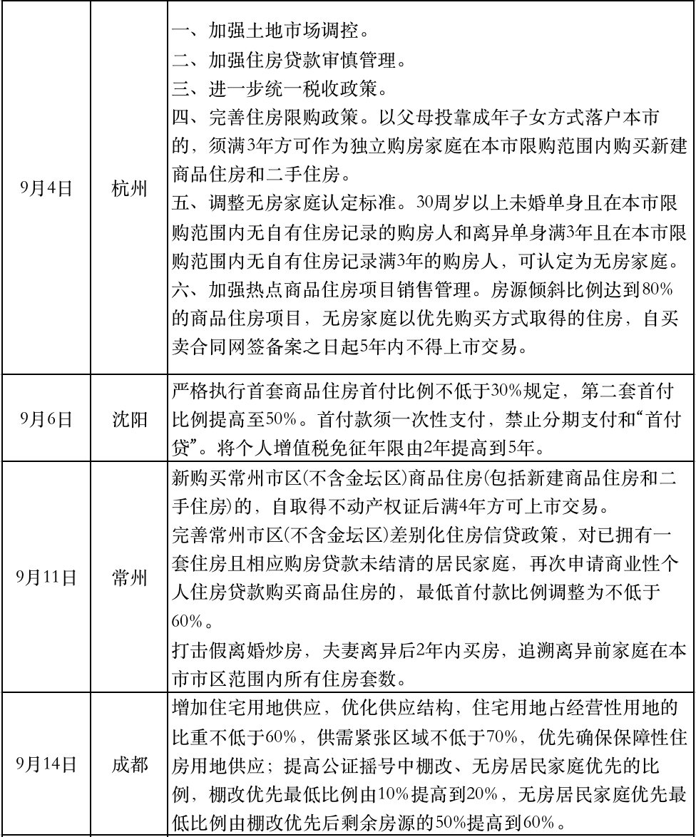 值得注意的是,三季度以來(lái),多個(gè)熱點(diǎn)城市出臺(tái)樓市調(diào)控背景下,樓市整體平穩(wěn)運(yùn)行,但三四線(xiàn)城市打補(bǔ)丁政策趨勢(shì)依然持續(xù),“房住不炒”全面升級(jí)。