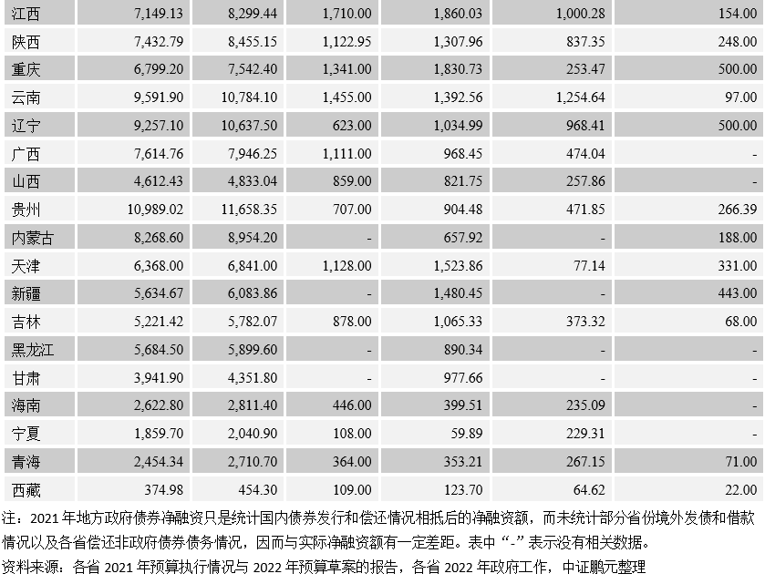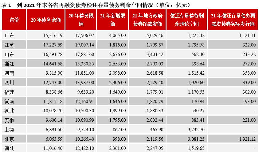 根據各省2021年已公布的2020年地方政府債務限額和余額、2021年新增地方債務限額以及2021年債券發行情況,通過上述公式計算,到2021年底償還存量政府債務的再融資債券剩余發行空間較大的省份為上海、北京、江蘇等,分別為3,232.70億元、3,081.25億元、1,795.58億元,剩余發行空間較小的是西藏和天津,分別為64.62億元、77.14億元,因而這兩個省份在2022年要通過再融資債券置換超過剩余空間更多的政府存量債務,必須通過增加2022年新增地方政府債務限額,或者通過財政資金償還更多的到期地方政府債券的方式。
