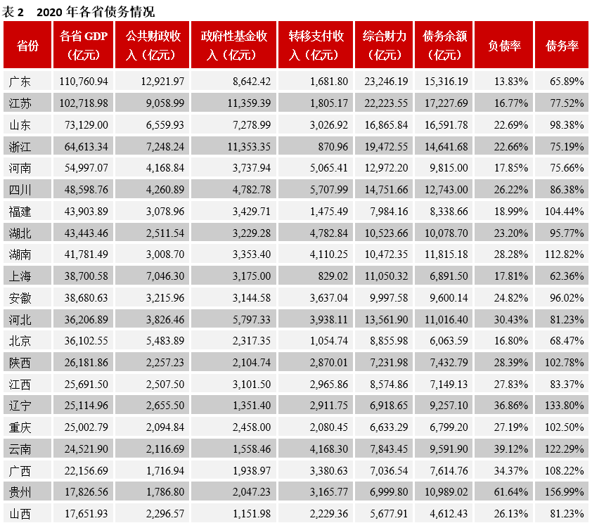 目前來看,國內評級機構均將地方政府債券信用評為AAA級,自2015年地方政府債券發行以來,也沒有出現過評級下調的情況,但近年來由于地方之間經濟財政實力的分化,地方政府償債能力也出現了一定的分化。國際上公認60%的負債率、90%-150%的債務率為安全警戒線,2020年地方政府顯性負債率超過60%的省份有貴州省,顯性債務率超過150%的省份有內蒙古、貴州和天津。