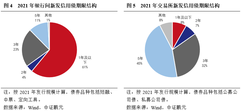 2020年5月,交易所債券市場開始試點短期公司債券。此前交易所債券市場缺乏短期限品種所致的兩市場期限結構差異的現場仍然存在。從2021年的新發行債券來看,不考慮跨市場品種,銀行間信用債加權期限為1.70年,交易所信用債加權期限為4.01年。期限結構上,銀行間信用債以1年期以下短期債券為主,發行規模占比61%,5年期及以上長期限債券的發行規模占比僅為12%;交易所信用債則以長期限為主,1年期及以下短期債券發行規模占比為8%,5年期及以上長期限債券的發行規模占比為51%。