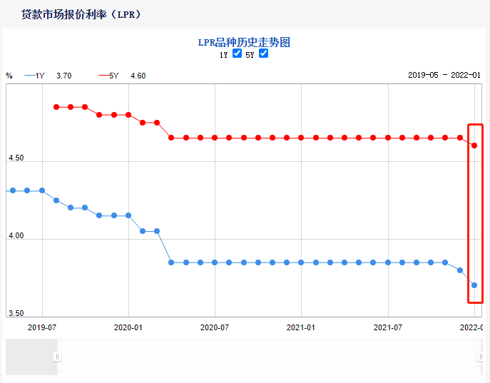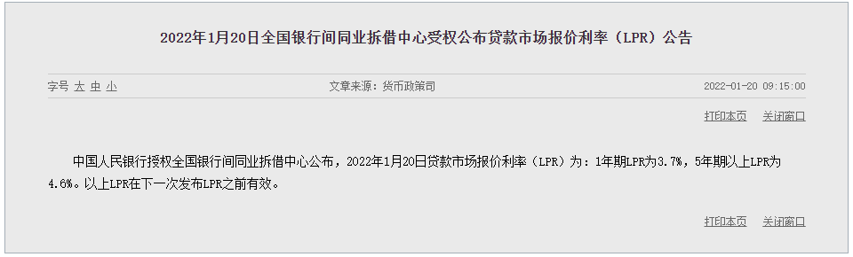 2022年1月20日貸款市場報(bào)價(jià)利率(LPR)為:1年期LPR為3.7%,5年期以上LPR為4.6%。