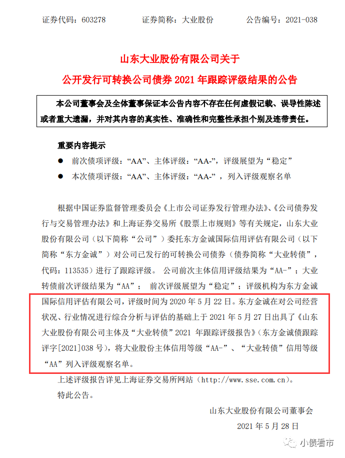 近日,大業(yè)股份(603278.SH)公告稱,東方金誠將其主體信用等級“AA-”、“大業(yè)轉債”信用等級“AA”列入評級觀察名單。