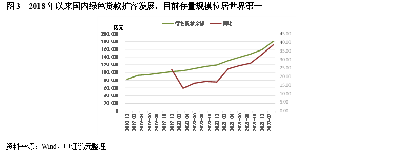 在這些政策的推動下,國內綠色貸款規模不斷擴容發展。根據人民銀行相關數據,2022年一季度末,綠色貸款余額18.07為萬億元,同比增長38.6%,增速創新高。目前,國內綠色貸款存量規模位居世界第一位。