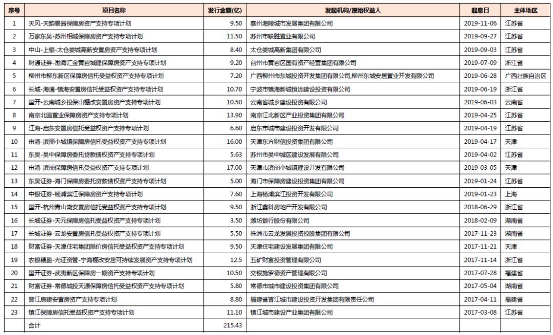 2017年至今,市場共成功發行23單保障性住房ABS,總募集資金規模為215.43億元,項目明細如下: