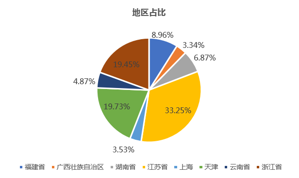 通過下圖可以發現,2019年保障性住房ABS較過往幾年出現了非常大的增長,截至2019年11月末,發行金額已經超過過去兩年之和。在地區分布方面,江蘇、浙江和天津位列前三,三個地區占比已經超過70%。