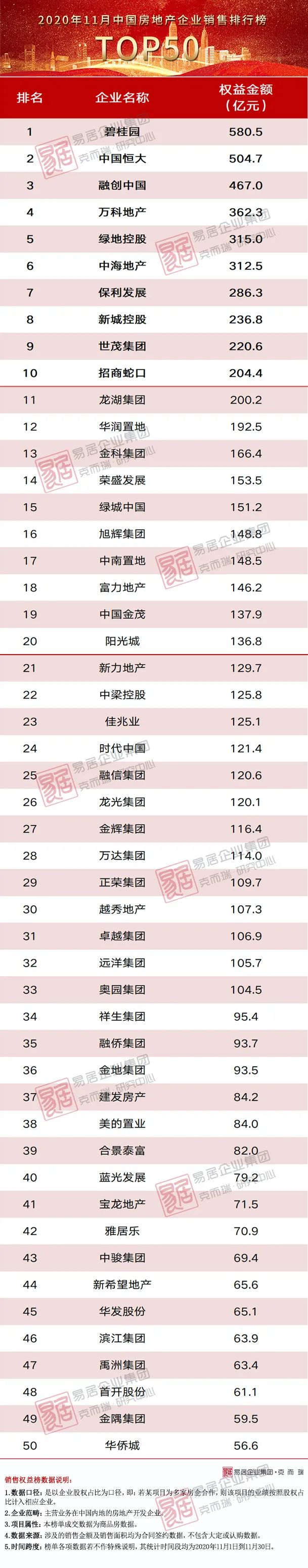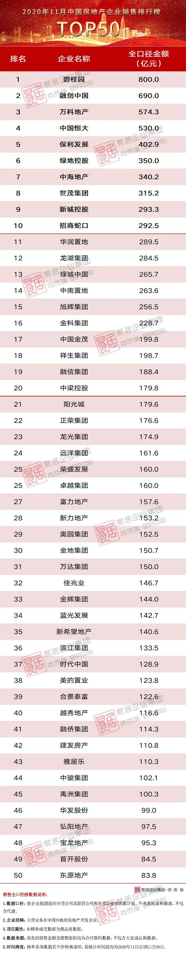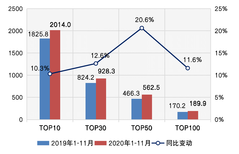 表:2020年1-11月百強房企業績表現及同比變動(億元)
