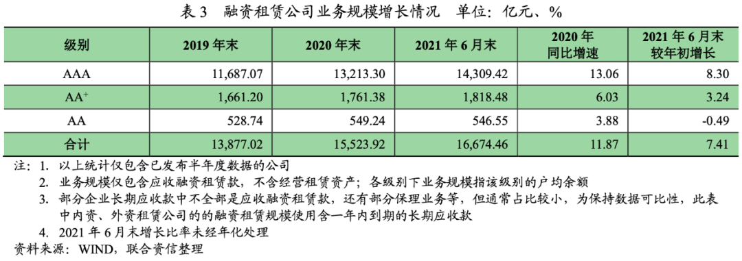 2021年以來,受疫情反復(fù)的影響,為了保持市場穩(wěn)定,資本市場資金面整體較為寬裕。從樣本公司經(jīng)營情況來看,2021年上半年,AAA級別[4]融資租賃公司業(yè)務(wù)規(guī)模較年初增長較快,主要系部分資質(zhì)較好的企業(yè)負(fù)債端再融資壓力相對較小,因此其在資產(chǎn)端能夠持續(xù)擴(kuò)大投放規(guī)模所致;AA+、AA級別融資租賃公司業(yè)務(wù)規(guī)模增速顯著低于AAA級別融資租賃公司,主要系行業(yè)內(nèi)部競爭加劇,實(shí)力偏弱的融資租賃公司面臨更大的壓力,需要注意的是,AA級別融資租賃公司業(yè)務(wù)規(guī)模較年初已經(jīng)出現(xiàn)小幅下滑的情況,未來需要對低評級公司的業(yè)務(wù)發(fā)展趨勢保持關(guān)注。另外,樣本內(nèi)能夠獲取到完整數(shù)據(jù)的融資租賃公司以中高級別居多,該部分企業(yè)通常資質(zhì)較好,受到外部融資環(huán)境結(jié)構(gòu)性緊張的影響相對較小,因此本文中樣本統(tǒng)計數(shù)據(jù)會與行業(yè)實(shí)際平均水平有一定的偏差。