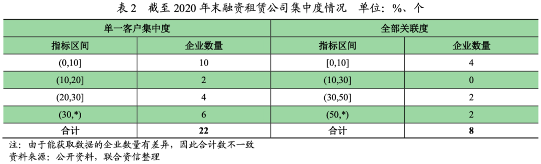 據(jù)了解,許多融資租賃公司尚未確定明確的轉(zhuǎn)型方案,尤其是對于關(guān)聯(lián)集中度超過50%的融資租賃公司。雖然融資租賃公司可能選擇采用與其他企業(yè)交換資產(chǎn)的方式來降低集中度,但未來能否順利施行仍有待觀察。部分融資租賃公司已經(jīng)開始拓展集團(tuán)外的業(yè)務(wù),由于租賃周期通常在3年以上并且對集團(tuán)外部業(yè)務(wù)的風(fēng)險把控能力有待檢驗(yàn),因此短期內(nèi)集中暴露風(fēng)險的可能性不大,但在未來的一個租賃周期及經(jīng)濟(jì)周期內(nèi)仍可能會出現(xiàn)資產(chǎn)質(zhì)量下降的情況。截至2020年末,公開并且能獲取到客戶集中度數(shù)據(jù)的融資租賃公司中單一客戶集中度超過30%的有6家;全部關(guān)聯(lián)度超過50%的有2家。