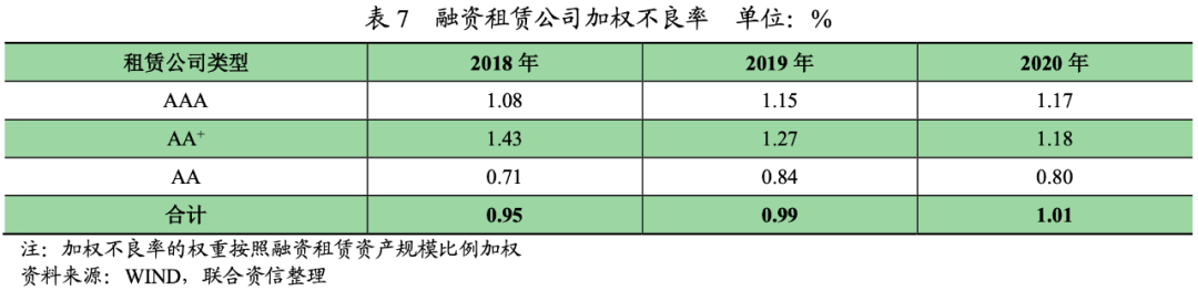 整體看,受近年來宏觀經(jīng)濟(jì)下行,信用風(fēng)險事件頻發(fā)影響,融資租賃公司不良率總體呈上升趨勢,資產(chǎn)質(zhì)量承壓,但部分風(fēng)控能力較強(qiáng)或主要開展產(chǎn)業(yè)集團(tuán)內(nèi)業(yè)務(wù)的融資租賃公司資產(chǎn)質(zhì)量仍能得到保障,不良率分化趨勢較顯著。在有披露2021年6月末不良率的17家樣本公司中,有5家樣本公司的2021年6月末的不良率較2020年末有所提高。