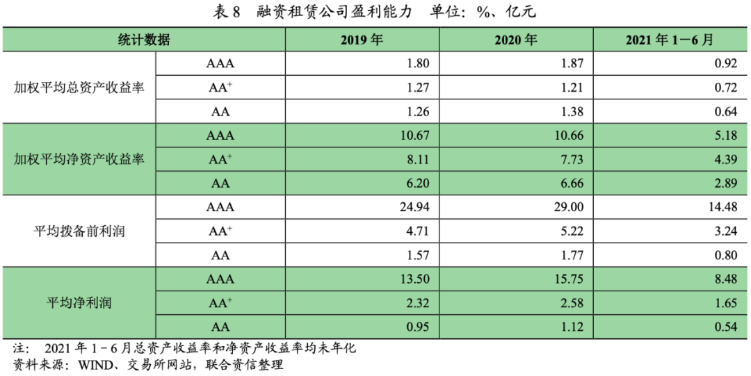 從利潤規(guī)模來看,2020年,AAA、AA+和AA級別融資租賃公司的平均撥備前利潤同比增長16.29%、10.74%和12.46%。2020年,AAA、AA+和AA級別融資租賃公司的平均凈利潤同比增長16.71%、10.85%和17.50%,AA級別融資租賃公司平均凈利潤增速最快,增速超過AAA級別融資租賃公司,其中AA級別融資租賃公司計提的減值準(zhǔn)備比例較低是原因之一。2021年上半年,AAA、AA+和AA級別融資租賃公司的平均凈利潤同比增長28.51%、33.08%和4.14%,各級別融資租賃公司凈利潤均實(shí)現(xiàn)增長,但是增速分化明顯。