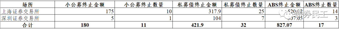 從私募債產(chǎn)品來(lái)看,單只債券最大終止金額為30億元,為蘭州新區(qū)城市發(fā)展投資集團(tuán)有限公司2021年面向?qū)I(yè)投資者非公開發(fā)行公司債券。最小終止金額為4億元,為重慶市石柱工業(yè)發(fā)展集團(tuán)有限公司2021年面向?qū)I(yè)投資者非公開發(fā)行公司債券。