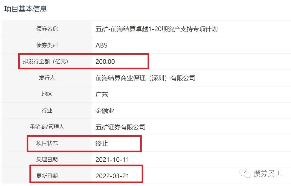 從具體申報(bào)產(chǎn)品的規(guī)模來(lái)看,單只債券終止金額最大的均是ABS產(chǎn)品,其中有4個(gè)ABS產(chǎn)品的金額為100億元,1個(gè)ABS的產(chǎn)品金額為200億元,均屬于儲(chǔ)架類ABS產(chǎn)品。2022年以來(lái),儲(chǔ)架類ABS產(chǎn)品終止的情況較多。重慶國(guó)際信托股份有限公司和廈門國(guó)際信托有限公司作為原始權(quán)益人申報(bào)的擬發(fā)行金額為400億元的“華融-新遠(yuǎn)1-20期資產(chǎn)支持專項(xiàng)計(jì)劃”于2022年1月20日終止。債券民工查詢了一下交易所系統(tǒng)信息,僅在2022年1月就有3只總申報(bào)規(guī)模超過(guò)100億元的ABS產(chǎn)品被終止。而2021年全年被終止的100億元的ABS產(chǎn)品就更多了,僅在上交所終止的產(chǎn)品就有50只。